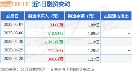 本站消息,5月7日,美国50ETF(513850)融资买入1014.17万元,融资偿还989.51万元,融资净买入24.66万元,融资余额1.09亿元,近20个交易日中有11个交易日出现融资净买入。